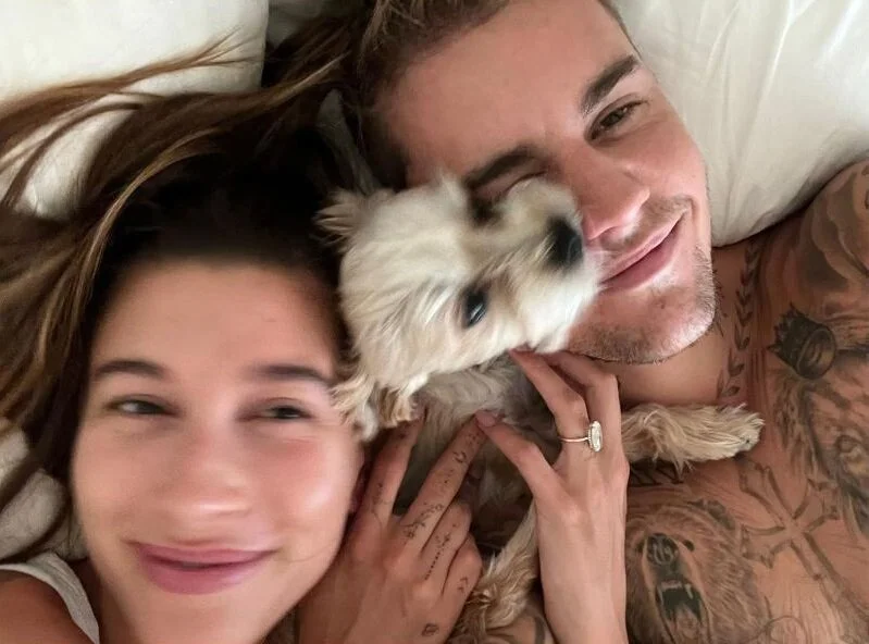 «Доброе утро от семьи Биберов», - подписал исполнитель хита «Peaches» постельное селфи с женой и собакой Йорки.