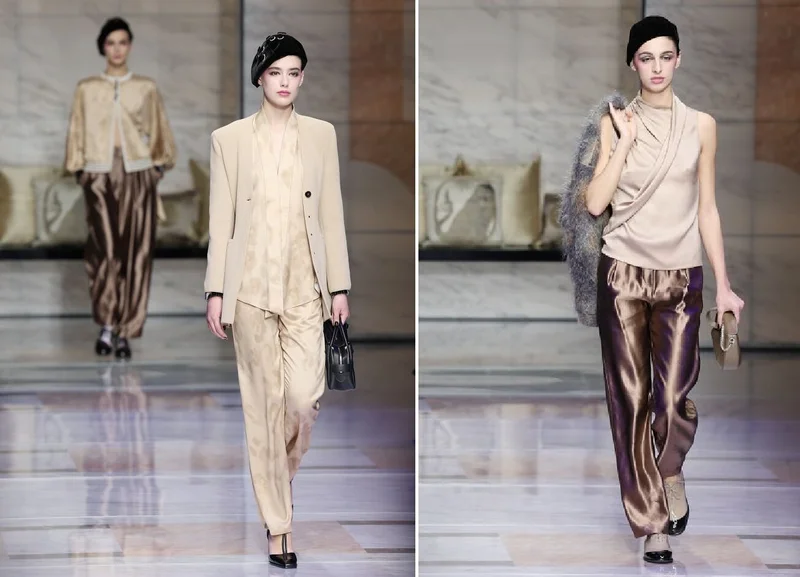 Ткани были мягкими, а формы текучими, как костюм в пижамном стиле из бледного атласа, дополненный подогнанным по фигуре жакетом (в конце концов, это же Армани) и линейкой струящихся брюк и платьев в тёмно-зелёных, дынных и медных тонах.