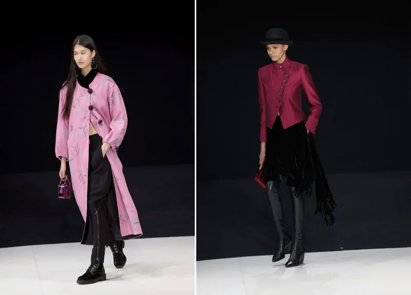 Модели продемонстрировали их с украшенными топами, приталенными жакетами или пальто, например, как в одном из вариантов с длиной до пола, розового цвета, напоминавшего цветущую вишню.