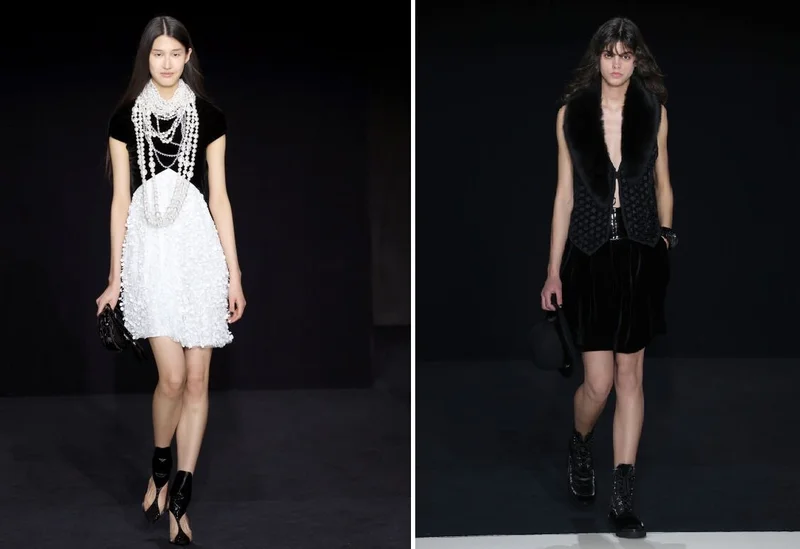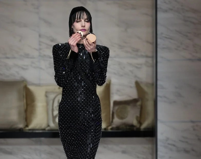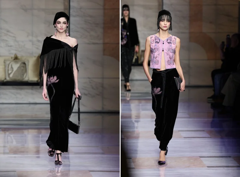 От розово-белого мраморного подиума с его маленькими банкетками и подушечками и до последней модели, открывшей пудру Giorgio Armani, чтобы освежить макияж, было ясно, что дизайнер подумал о личном пространстве и тихих моментах за дверями будуара.