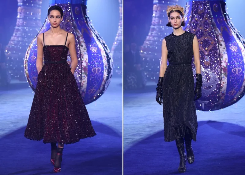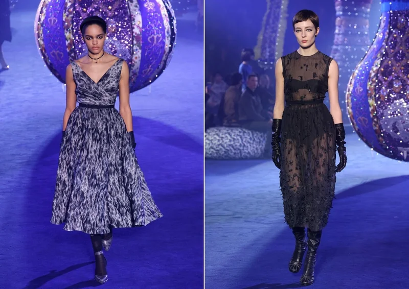 «Если мы подумаем о силуэте Dior, то он в некотором роде хорошо очерчен. С этим добавлением металла всё теряет эту идею чёткости», - говорит она. Кожаные перчатки и солнцезащитные очки «кошачий глаз» придавали небрежный вид чёрному платью-сорочке из жатой ткани, тогда как жакеты «песочные часы» с рукавами-тюльпанами были преподнесены расстёгнутыми поверх чёрных бюстгальтеров.