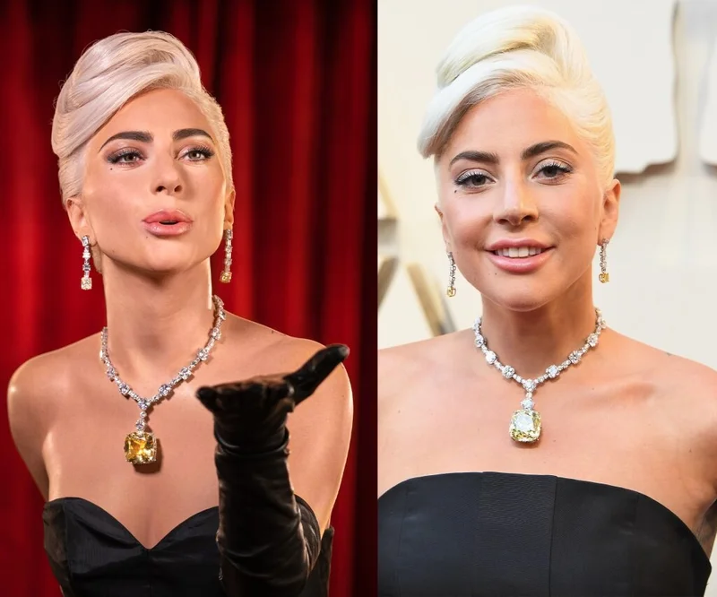 Фигура Леди Гаги в Музее; Леди Гага на церемонии "Оскар", 2019. Источник фото: Madame Tussauds Hollywood, Steve Granitz/WireImage via Getty.