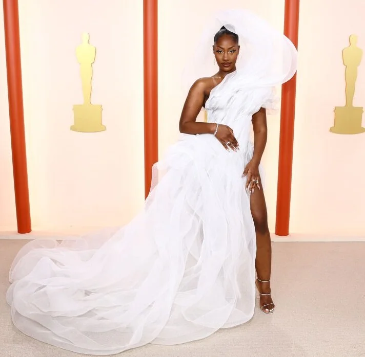 Певица нигерийского происхождения продемонстрировала на «Оскаре» фантазийный образ от Lever Couture. Классический бальный стиль разбавлял массивный воротник, белым облаком окутавший плечи и голову артистки. Ну, и, конечно, контраст с тёмной кожей сделал своё дело, выглядела Tems волшебно и в то же время очень нежно.