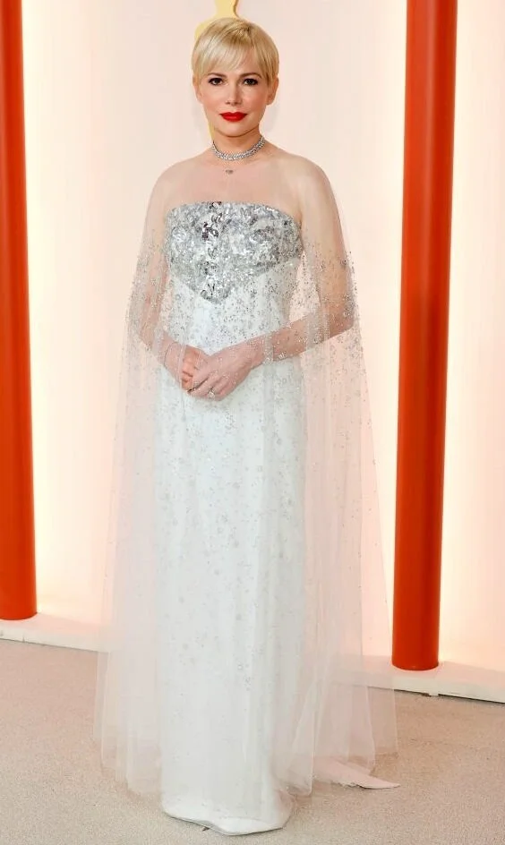 Актриса выглядела очаровательно в нежном белом платье с серебристой вышивкой от Chanel. Кейп из прозрачной сияющей сетки ещё больше «смягчил» и без того деликатный наряд. Короткая стрижка на светлых волосах, красная помада, небольшие ювелирные украшения довершили ангелоподобный образ Мишель.