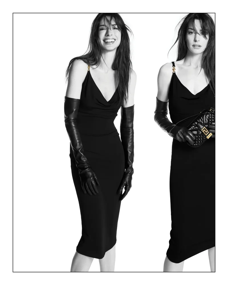 Энн Хэтэуэй представила два чёрных платья от Versace – мини и миди – на чёрно-белых фотографиях. Классический предмет одежды бессменный креативный директор итальянского модного дома Донателла Версаче обыграла с помощью кроя, вида ткани и блестящих металлических застёжек на бретелях.