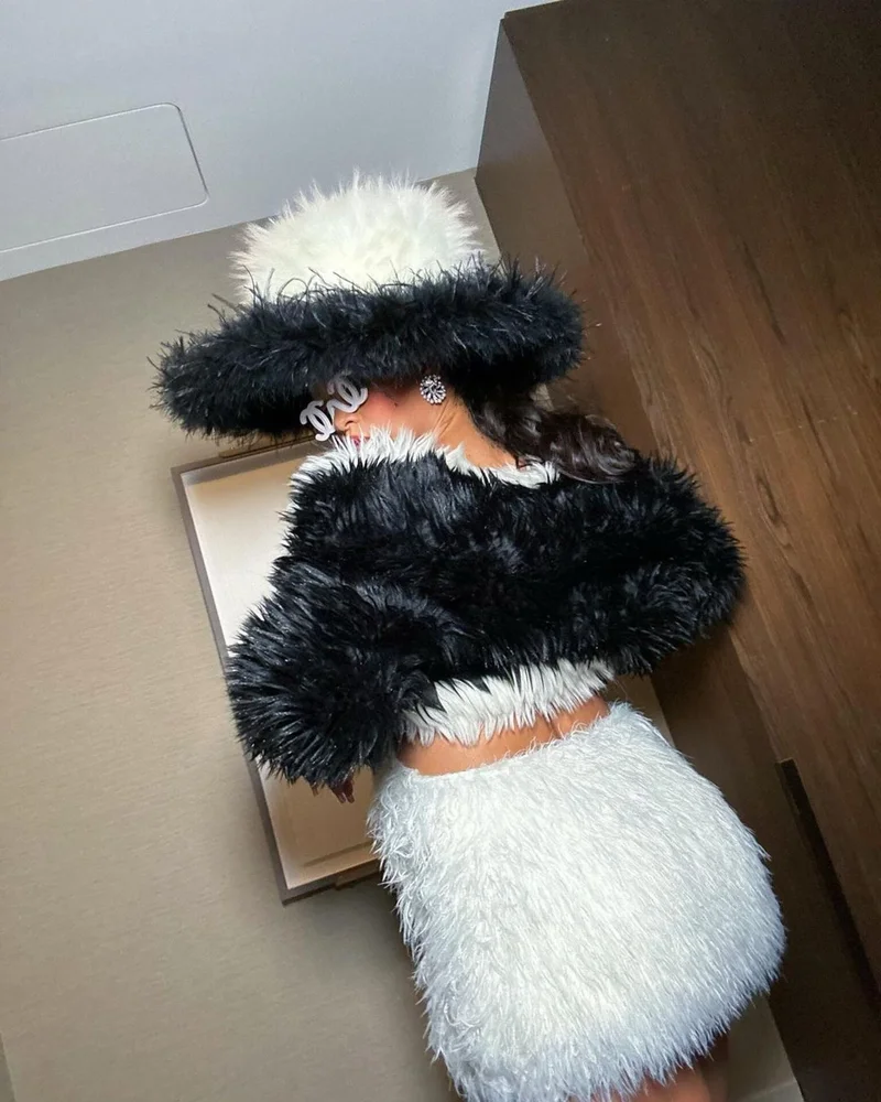 Для выхода в свет 35-летняя певица выбрала чёрно-белую гамму и «меховую» фактуру.