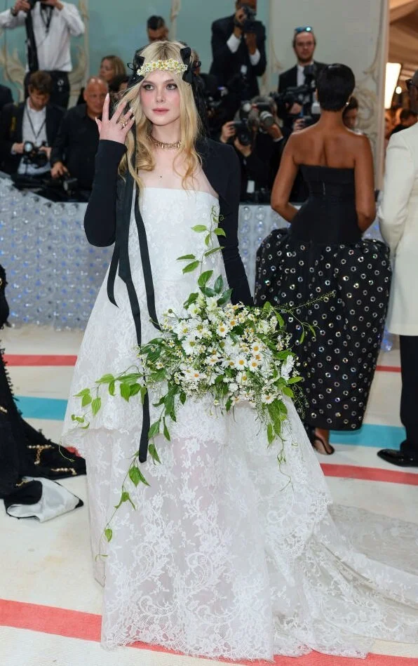 Кружевным платьем от креативного директора британского модного дома Андреаса Кронталера, чёрным жакетом и аксессуарами в виде ромашек 25-летняя актриса отдала дань уважения одной знаменательной фотосессии. Несколько лет назад её в подобном образе фотографировал лично Лагерфельд. В качестве завершающего штриха звезда «Великой» добавила ювелирные украшения от Cartier.
