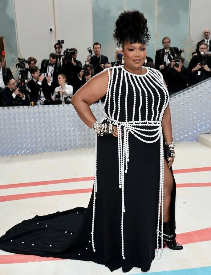 Пример того, как можно стильно и элегантно одеть женщину с пышной фигурой. И чтобы при этом она себя чувствовала самой желанной клиенткой в модном доме, созданном Коко Шанель. В самом Chanel этот образ 35-летней певицы называют «особенным», украсив его множеством фирменных аксессуаров – нитями из жемчуга, браслетами, кольцами и серьгами. Из обуви Лиззо остановила свой выбор на ботильонах от Jimmy Choo.