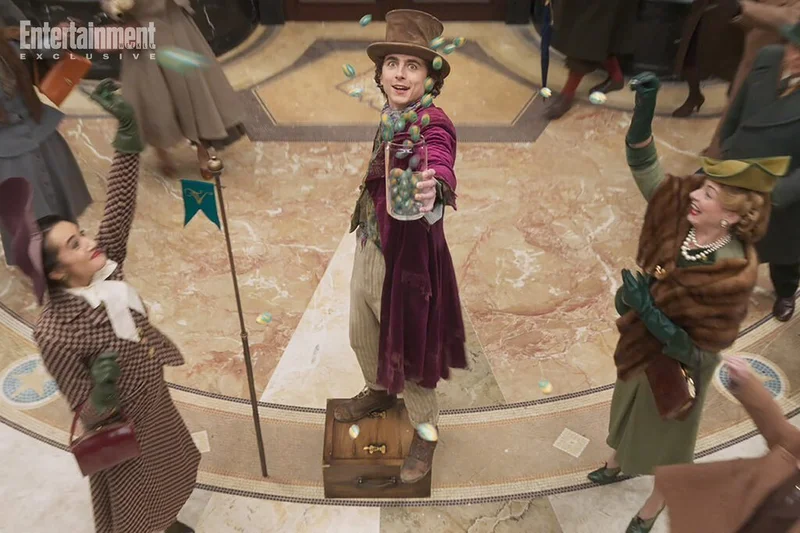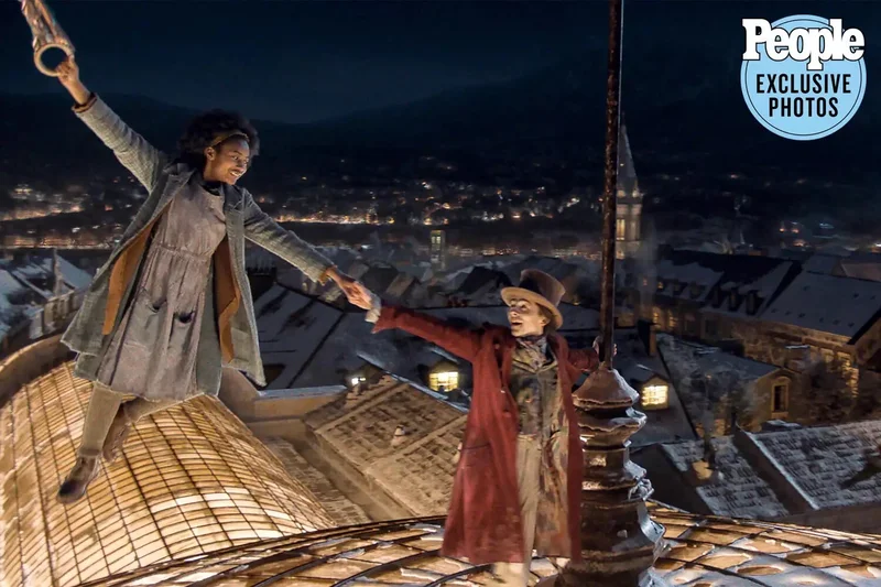 На одном из снимков можно также увидеть Хью Гранта в роли Умпа-лумпы ростом не больше 50-и сантиметров. На другой фотографии Шаламе держится за партнёршу Калу Лэйн, когда её героиня пытается улететь. По словам режиссёра Пола Кинга, Тимоти – феноменальный актёр, который внёс собственный драйв в культовую роль.