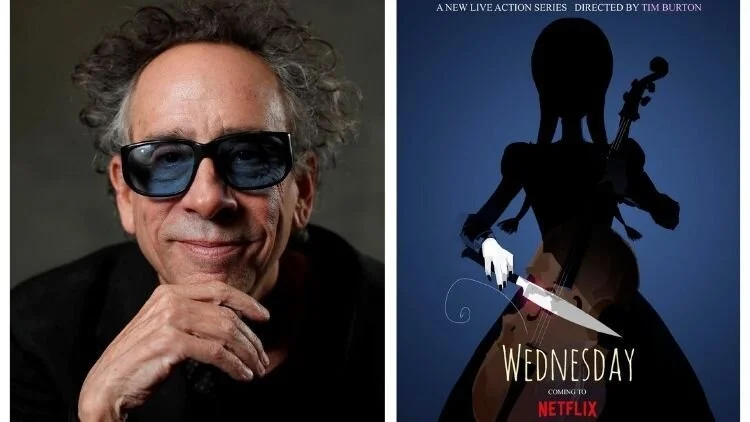 Тим Бёртон и постер его нового сериала "Уэнсдэй", 2022. Источник фото: Netflix.