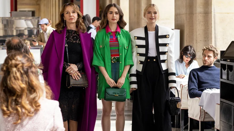 Филиппин Леруа-Больё, Лили Коллинз и Камилль Раза в сериале "Эмили в Париже" (с 2020). Источник фото: Netflix.