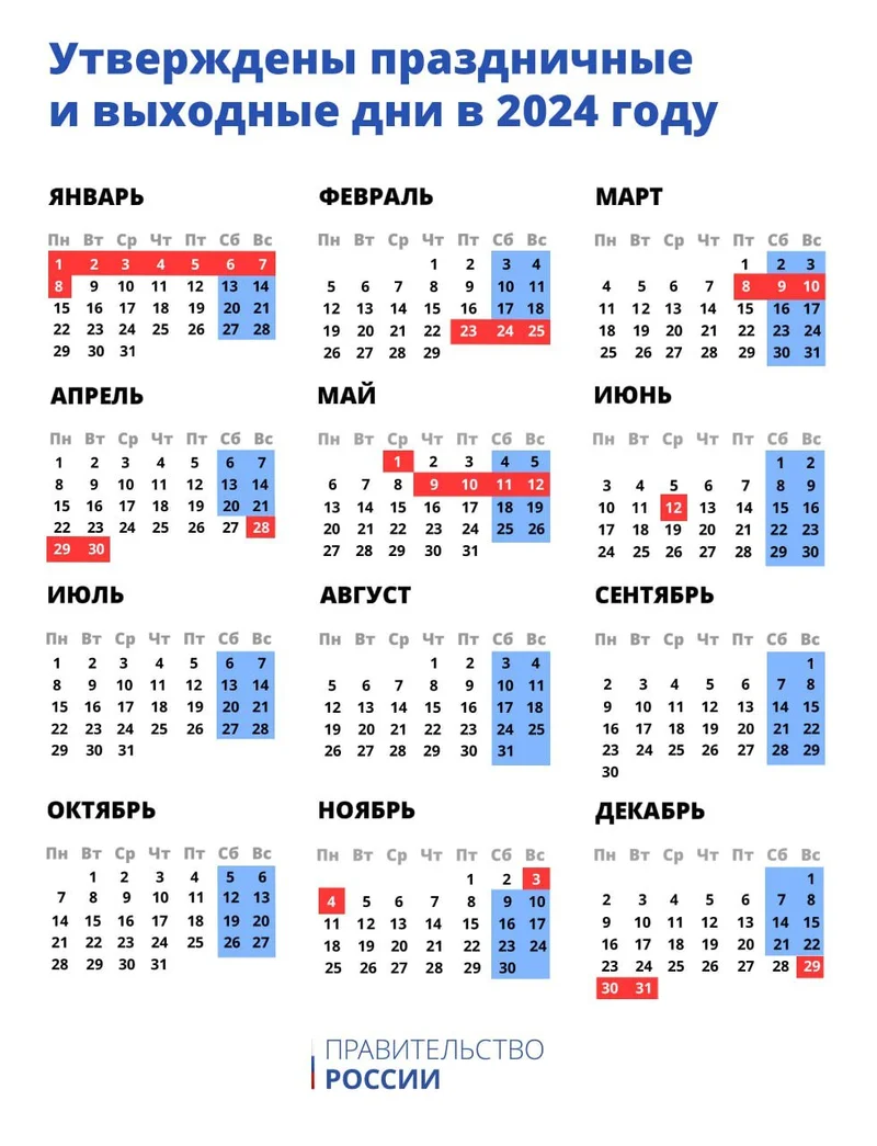 Правительство России утвердило выходные дни на 2024 год