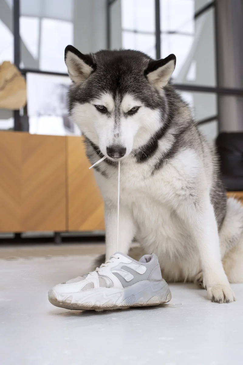 Хаски грызет шнурки.