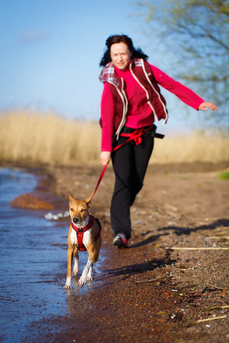 Для занятий важно, чтобы ваша собака носила упряжь без колец, карабинов или других предметов, которые могут причинить ей травмы либо от трения, либо от удара. Шлейка крепится амортизирующим шнуром с быстроразъемным карабином (чтобы в случае непредвиденной ситуации ее можно было легко расстегнуть) к специальному поясу, предназначенному для занятий этим видом спорта. Он надевается на бедра бегуна. Амортизирующий шнур необходим для того, чтобы предотвратить возможные травмы спины как собаке, так и человеку.