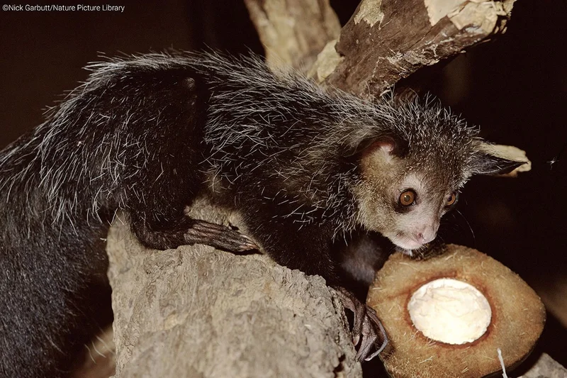 Ай-ай — это ночное приматовое млекопитающее, обитающее на Мадагаскаре. У этого создания длинный средний палец, которым оно выискивает насекомых в коре деревьев. Ай-ай выглядит довольно необычно и даже пугающе из-за своих больших глаз и странного пальца, однако он совершенно безобиден.