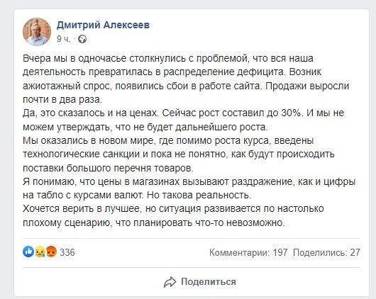 По сообщению ряда СМИ со ссылкой на пост в Facebook *(принадлежит организации, признанной в РФ экстремистской с 21 марта 2022 года и запрещена на территории РФ) главы компании DNS Дмитрия Алексеева сообщают, что рост цен на бытовую технику ретейлера составил до 30%.