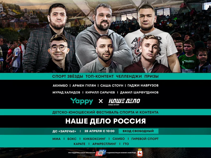 Бойцовская лига "Наше Дело" при поддержке Союза ММА России 28 апреля проведет в Нижнем Новгороде крупномасштабный детско-юношеский фестиваль спорта и контента "Наше Дело – Россия", целью которого является развитие детско-юношеского спорта и популяризация здорового образа жизни в регионе.