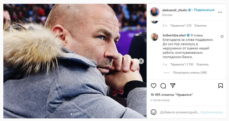 "Я очень благодарна за слова поддержки. До сих пор нахожусь в недоумении от оценки нашей работы многоуважаемым господином Бахом", – написала Тутберидзе в комментариях к посту Жулина с обращением к главе МОК.