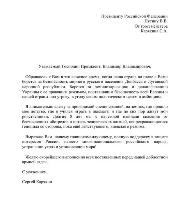 Ранее Сергей Карякин опубликовал на своих страницах в соцсетях соответствующий пост с письмом президенту России Владимиру Путину со словами поддержки.