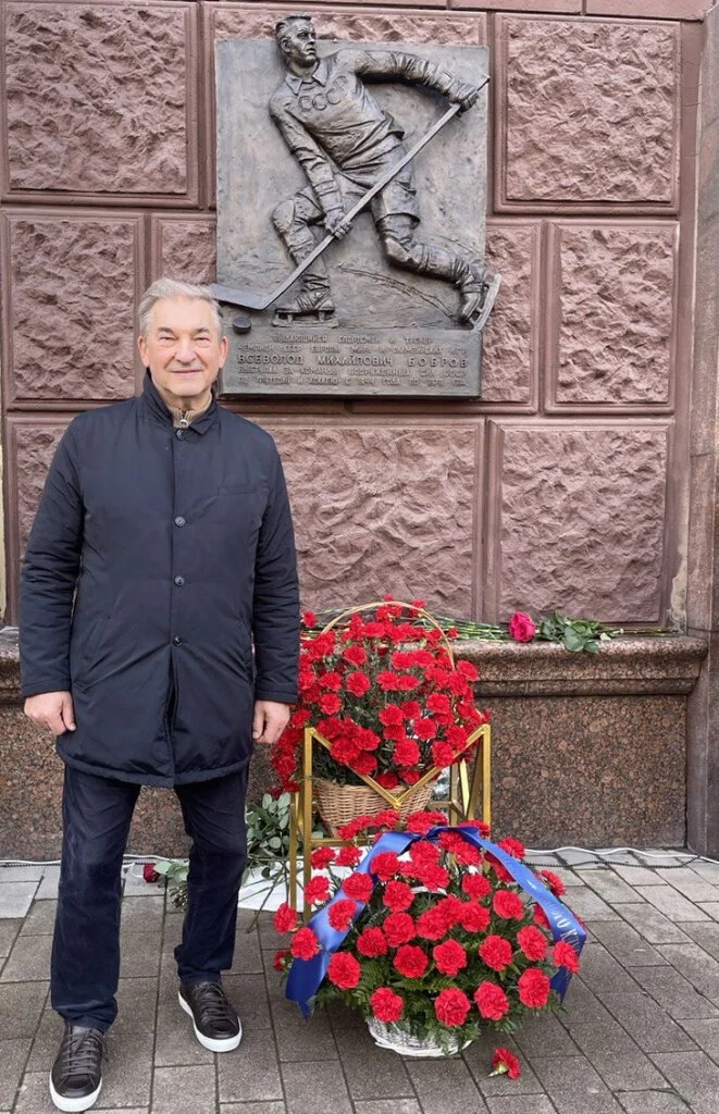Владислав Третьяк у мемориальной доски Всеволоду Боброву Источник фото: ФХР