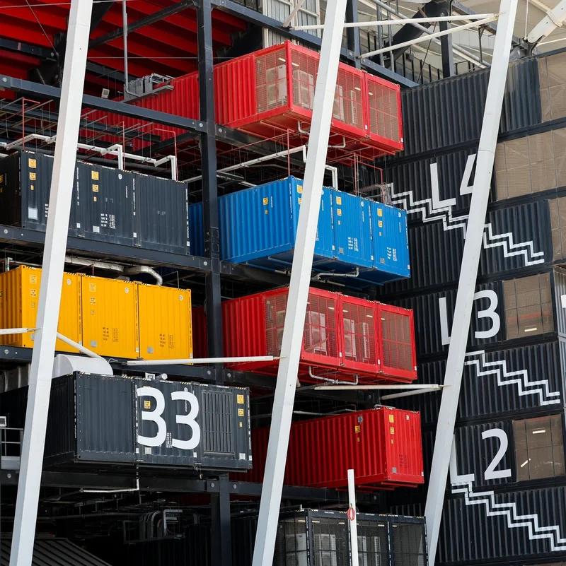 Это первый полностью разборный крытый футбольный стадион, выполненный из морских контейнеров.