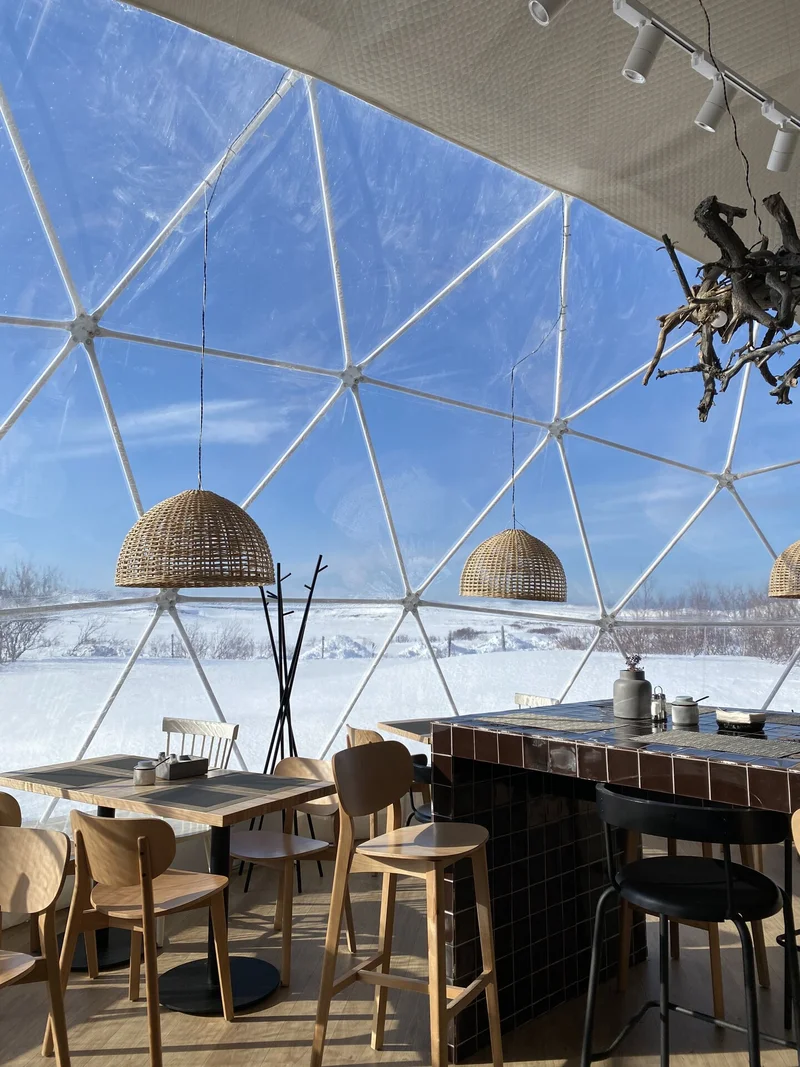 Рядом с отелем расположился гастропаб “Mole” в шатре-юрте. Меню - нордическое, блюда и напитки - авторские, цены - московские. Попробовали несколько позиций меню - вкусно. Даже кофе, несмотря на то что варят на смеси арабики и робусты (70/30) оказался достаточно приятным. Лучшее заведение в поселке. Кажется, единственное.