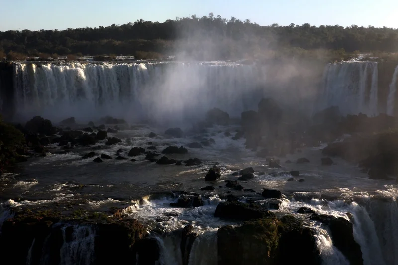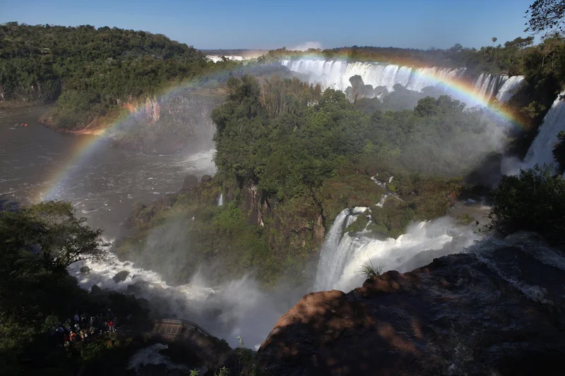 Глотка Дьявола. Невозможно побывать на водопадах Игуасу и не увидеть главную достопримечательность - водопад Глотка Дьявола. Он имеет форму подковы и проходит ровно по границе Аргентины и Бразилии. Посетители могут пройти по мосту почти в самое сердце этого водопада, ощутив всю его силу, потому что он настолько мощный, что брызги летят во все стороны, создавая завесу.