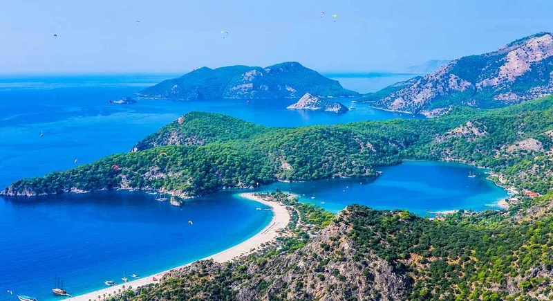 Олюдениз и его голубая лагуна - одна из жемчужин Средиземноморья Турции. В высокий сезон он переполнен как отечественными, так и иностранными туристами. Прекрасные окрестности делают его незаменимым на любом маршруте по стране. Фактически, с окрестных гор летают разные парапланы, демонстрирующие насыщенный синий цвет лагуны, охраняемой национальным парком. Вход платный, но он того стоит.