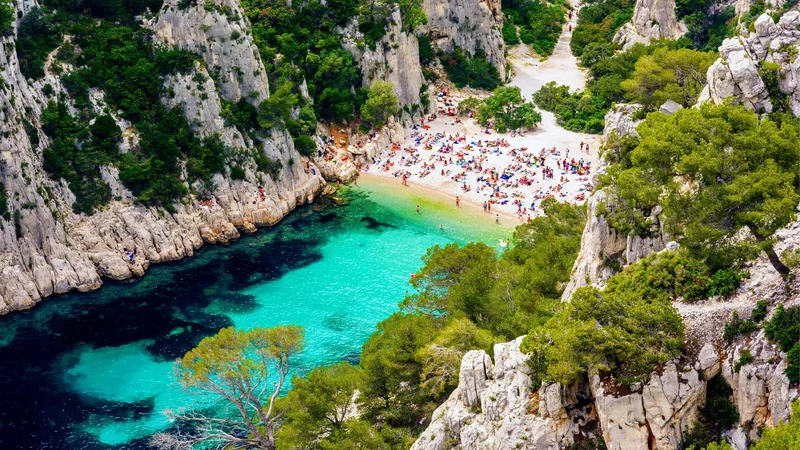Лазурный берег Франции - рай для любителей пляжного отдыха. Например, этот. Это небольшая бухта среди крутых ущелий со средиземноморской растительностью. Сверху вы видите бирюзово-синее море, спускающееся к пляжу. Море настолько кристально чистое, что кажется, что парусные лодки плывут, а не плывут. Характерный для побережья Прованса, он расположен недалеко от города Кассис, но добраться до него можно только на лодке или после прогулки продолжительностью чуть более двух часов.