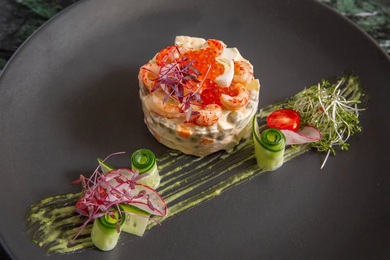 Оливье с раковыми шейками и крупнозернистой красной икрой Источник фото: Пресс-служба «Балчуг Кемпински Москва»