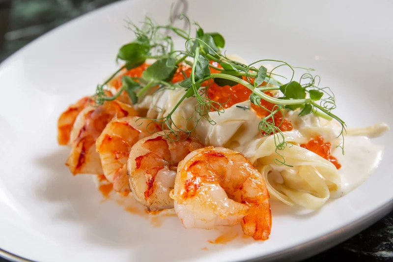 Паста лингвини «Аляска» с жаренными на гриле креветками и красной икрой со сливочным соусом Источник фото: Пресс-служба «Балчуг Кемпински Москва»