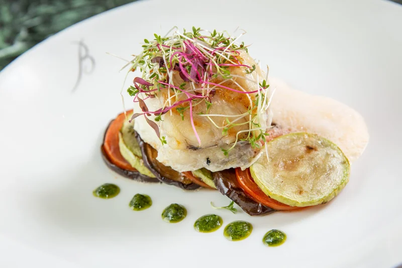 - жареный морской черт с прованскими овощами и эспумой из пармезана;